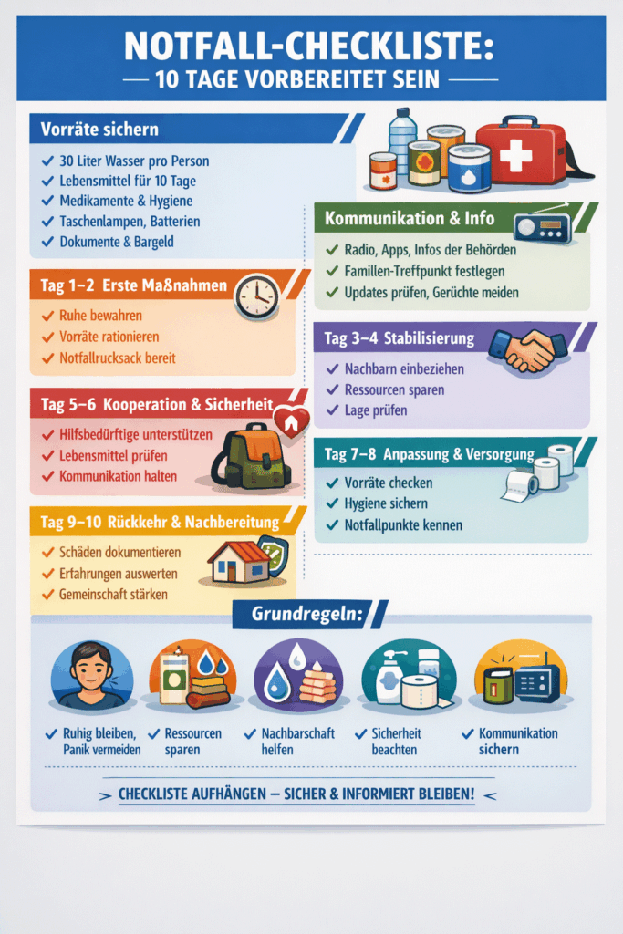 Mit diesem Plan kann eine Familie oder ein Haushalt 10 Tage autark, sicher und handlungsfähig bleiben. Gleichzeitig wird die Kooperation mit Nachbarn und Gemeinde gestärkt, was in Krisen den größten Unterschied macht.